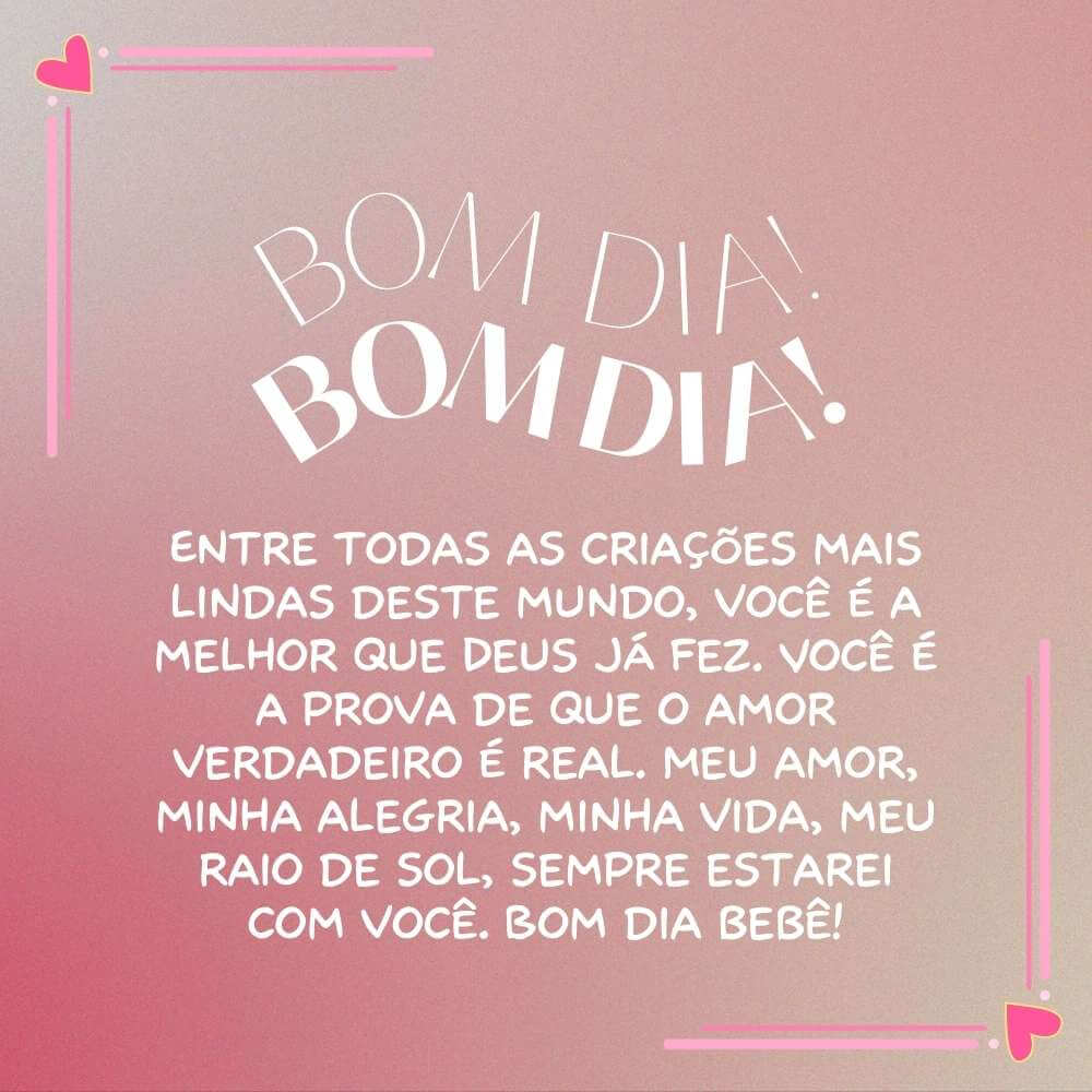 1. Entre todas as criações mais lindas deste mundo, você é a melhor que Deus já fez. Você é a prova de que o amor verdadeiro é real. Meu amor, minha alegria, minha vida, meu raio de sol, sempre estarei com você. Bom dia bebê!