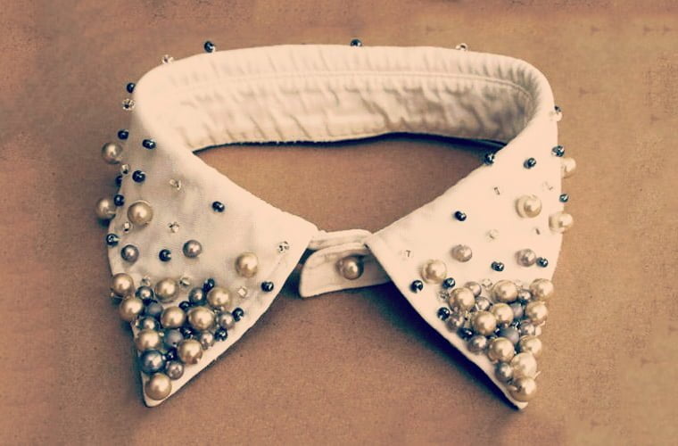 Em seguida, comece a customizar o colar. Para isso, separe as pérolas e miçangas maiores e custure-as nas bordas da gola. Alterne entre grandes e pequenas, para que dê um efeito mais bonito. Preencha todo um canto, como se tivesse fazendo o formato de um triângulo.