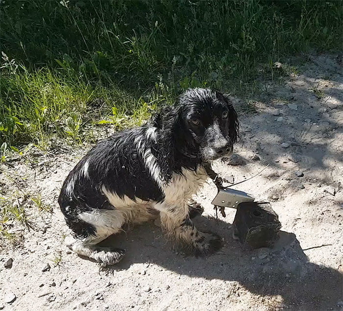Depois que ela deu uma olhada mais de perto, notou uma grande âncora de metal amarrada no pescoço do pobre cachorro. Audra imediatamente percebeu que alguém tentou tirar a vida desse lindo cachorrinho.